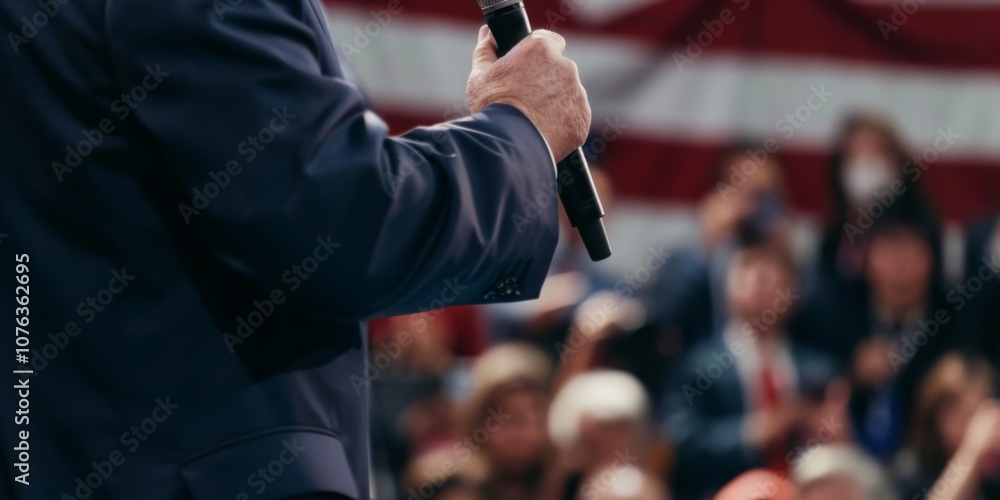 A politician passionately addresses a large, engaged audience, holding a microphone while standing before a backdrop of an American flag, showcasing the energy of the political event. #1076362695