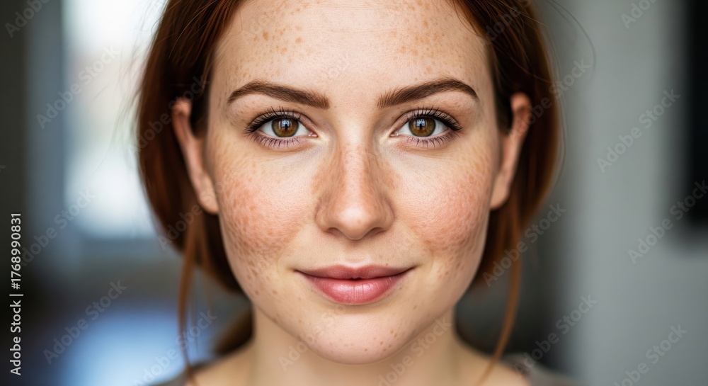 A portrait of a Western European woman, fair skin with freckles and melasma spots, natural soft smile, realistic color grading, fine art portrait style, shallow depth of field, 8K #1768990831