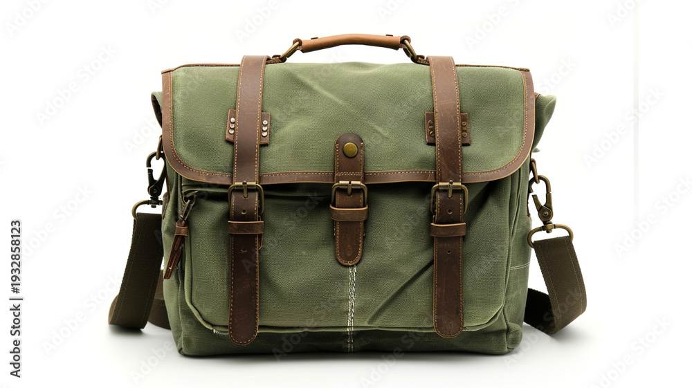 A practical green canvas messenger bag with leather straps isolated on white, ideal for business and travel technology. #1932858123