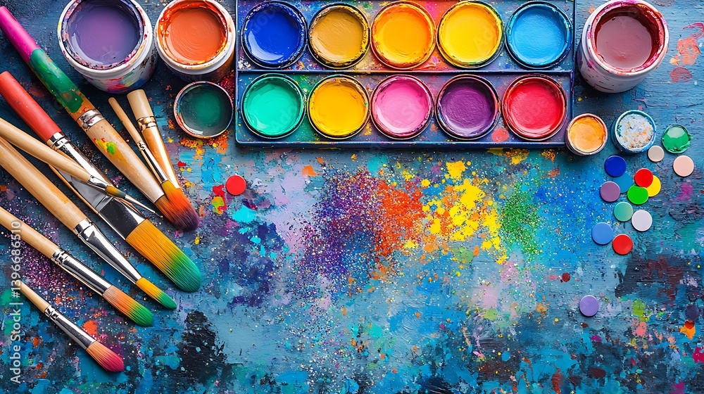 A pride-themed art desk with rainbow paint palettes, glitter, acrylics, brushes in mugs, and pride pins scattered across a textured background. Created Using: chaotic artistic styling, #1396686510