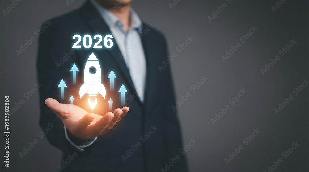 A professional businessman in a dark suit presents a glowing rocket icon with the year 2026, symbolizing ambitious growth and future success. #1937902808