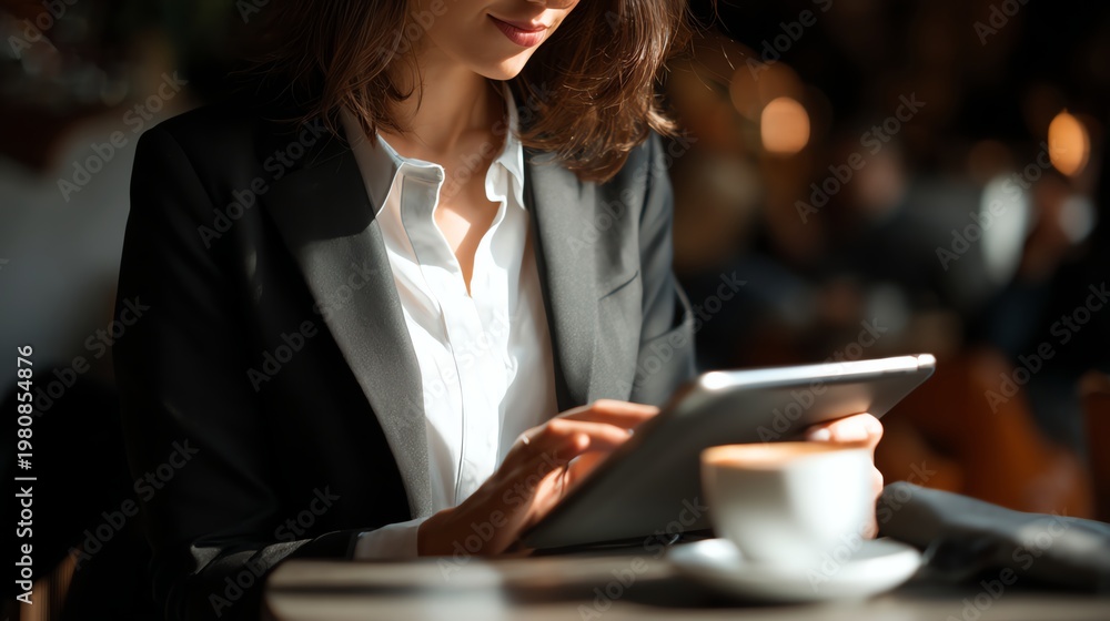A professional woman sitting in a cozy cafe, engaging with a tablet #1980854876