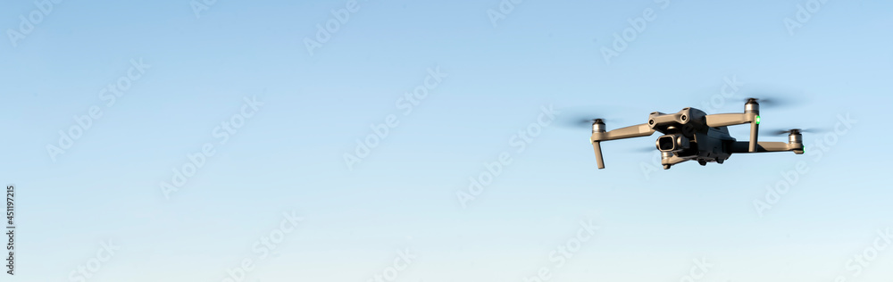 a quadrocopter drone flying across a clear blue sky. aerial photo shooting with the help of modern devices and technologies. a panoramic photo from copy space. helicopter camera in the air, flight and #451197215