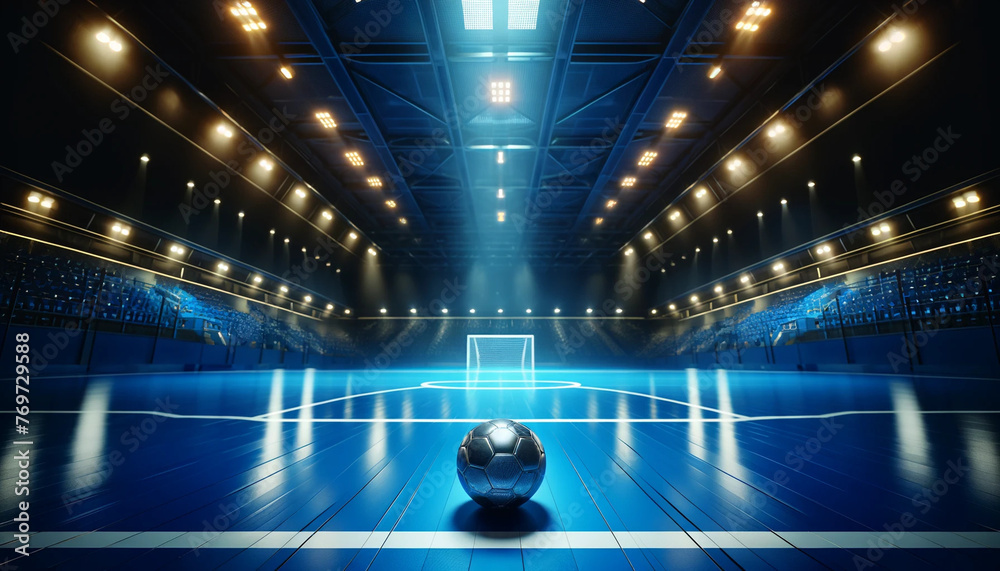 A realistic and detailed image featuring a futsal ball placed in the center of an indoor futsal court #769729588