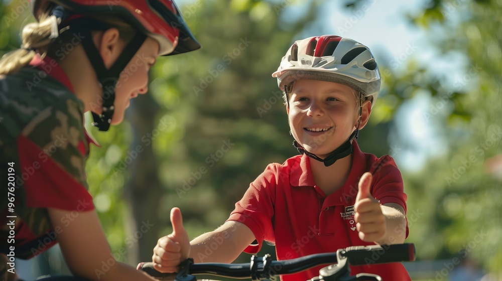 a realistic photograph quality image of an 8 year old kid on a sunny day sitting on a bicycle #967620194