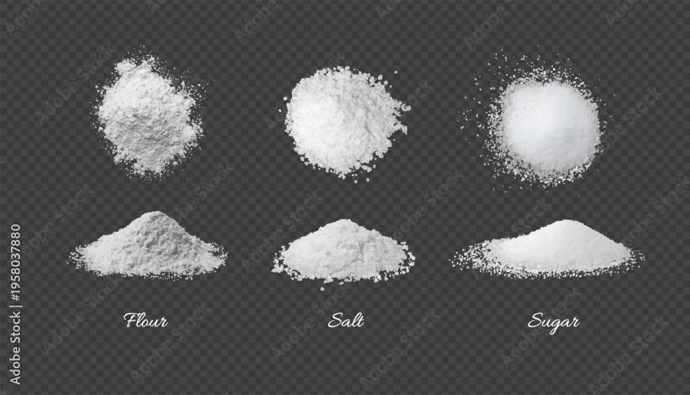 A realistic set of white crystalline piles of flour, salt, and sugar, viewed from the side and top. #1958037880