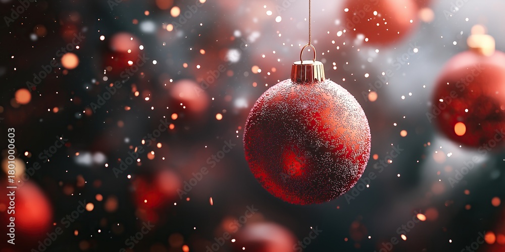 A red Christmas ornament on a blurred background with falling snowflakes and festive decorations creating a holiday concept atmosphere #1801000603