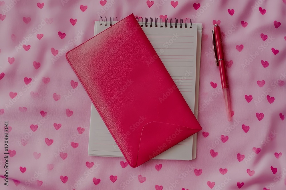 A red envelope adorned with white letters and scattered hearts on a soft pink backdrop, capturing the essence of romance and Valentine's Day with its colorful and thematic appeal. #1204613041