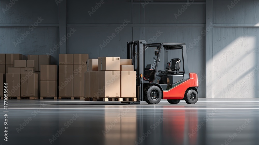 A red forklift stands beside stacks of cardboard boxes in a well-lit warehouse, showcasing an efficient storage and logistics environment. #1771053566