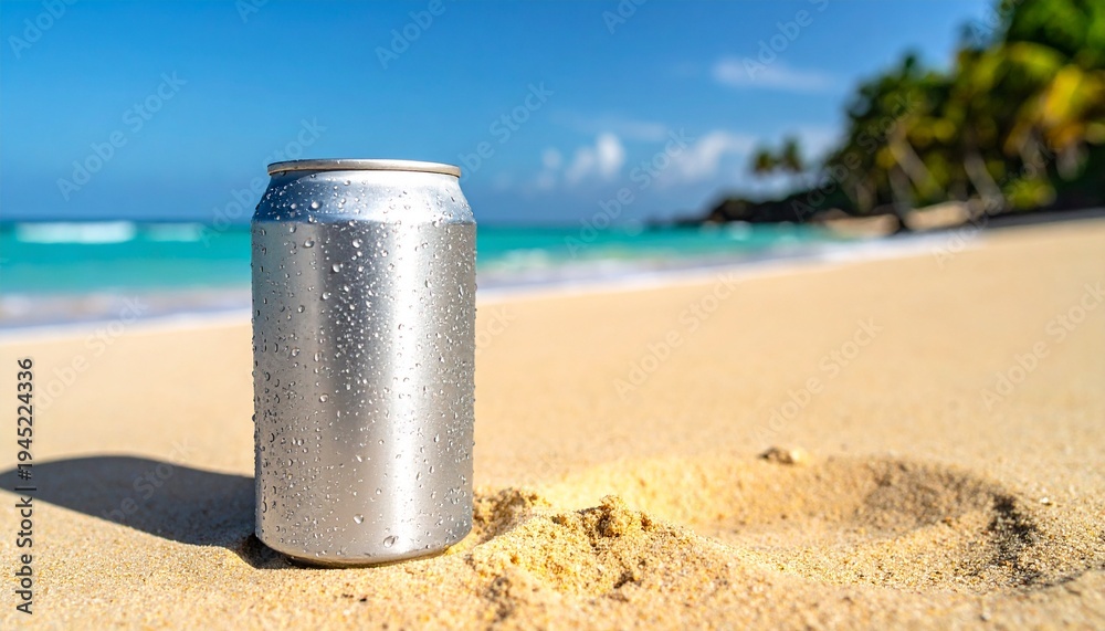 A refreshing can of beverage sits on a sandy beach under a bright blue sky, the perfect summer day scene! #1945224336