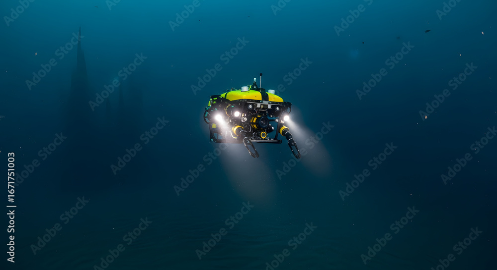 A remotely operated vehicle (ROV) with powerful lights and manipulator arms explores the dark mysterious abyss of the deep ocean floor. #1671751003