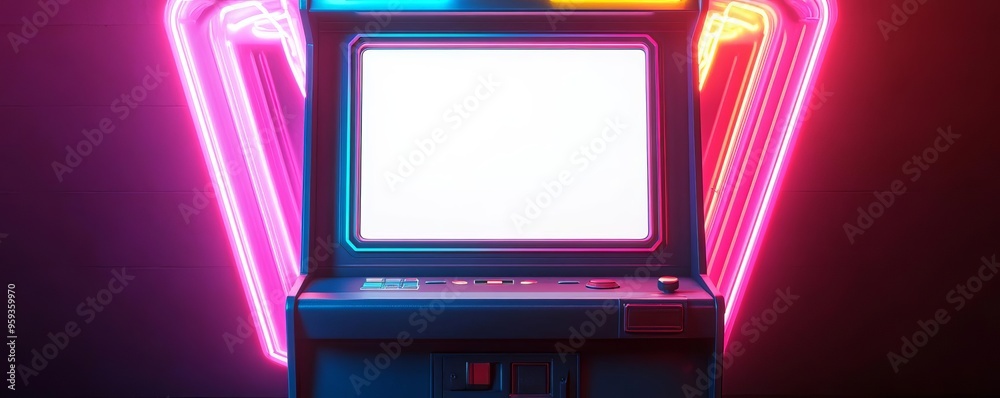 A retro arcade machine with an empty white screen, surrounded by neon lights in a dark arcade, captured in a vibrant, colorful photo style #959359970