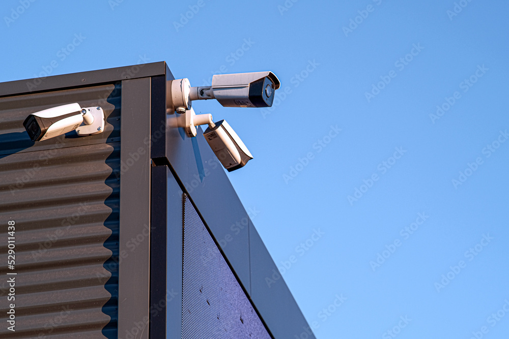 A review of surveillance cameras on white background. Security concept. Facial recognition. Program search for criminals. #529011438