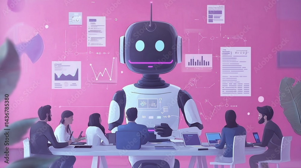 A robot leading a meeting with humans with data charts in a pink office environment setting scene #1436785380