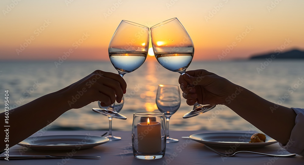A romantic couple celebrates with a toast, clinking wine glasses together against a breathtaking sunset over the ocean. #1607395404