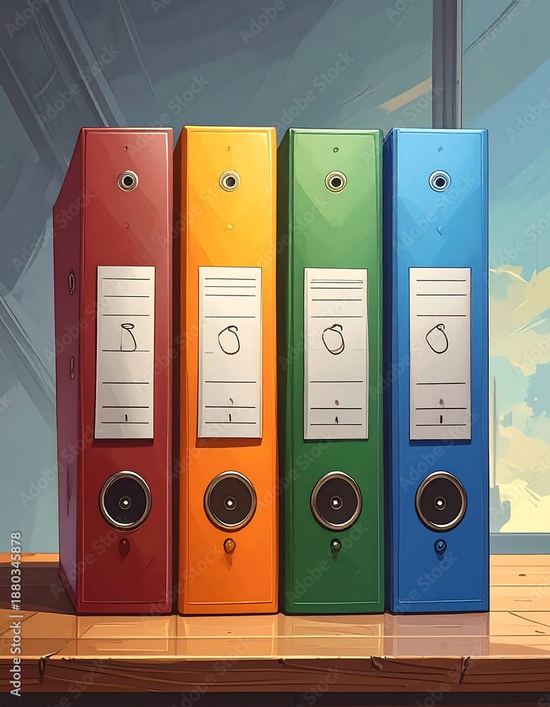 A row of colorful, upright document binders sit on a wooden surface in front of a window, bathed in sunlight. Each binder features a label #1880345878