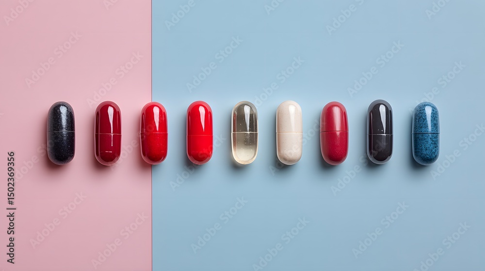 A row of different colored capsule pills are aligned on a split background of pink and blue, representing health, wellness, and the concept of duality in medicine. #1502369356