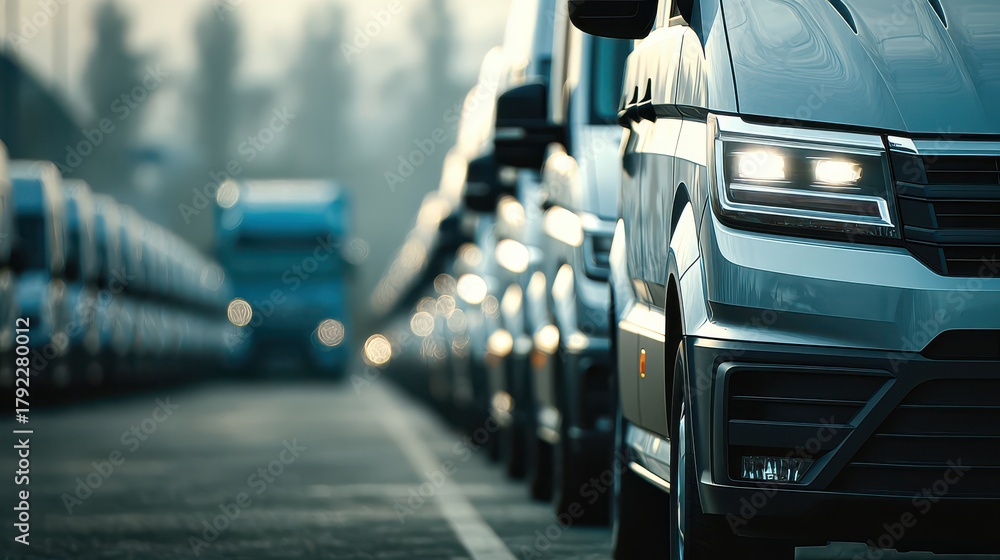 A row of vans parked in a lot, with a truck in the background, showcasing commercial vehicles #1792280012