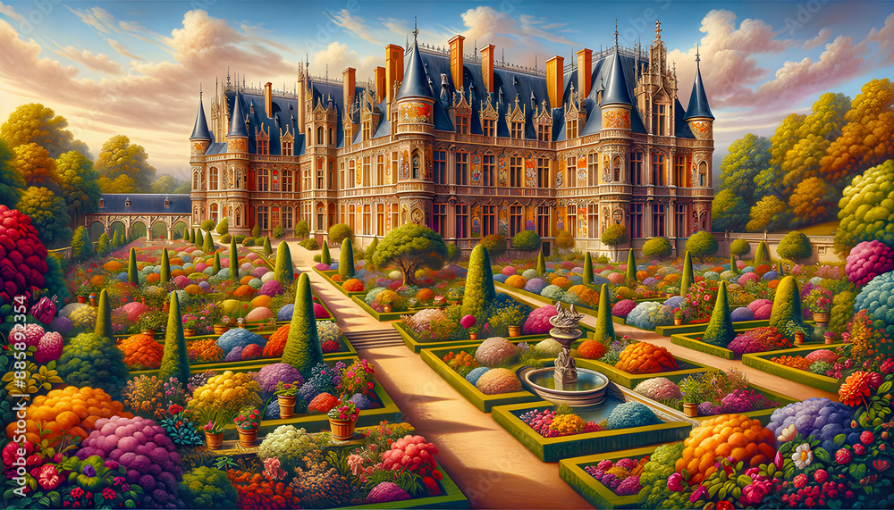 A royal estate mansion castle features grandiose gardens with manicured lawns, elegant fountains, and vibrant flowerbeds, creating an opulent and serene setting of historical splendor and natural beau #885892354