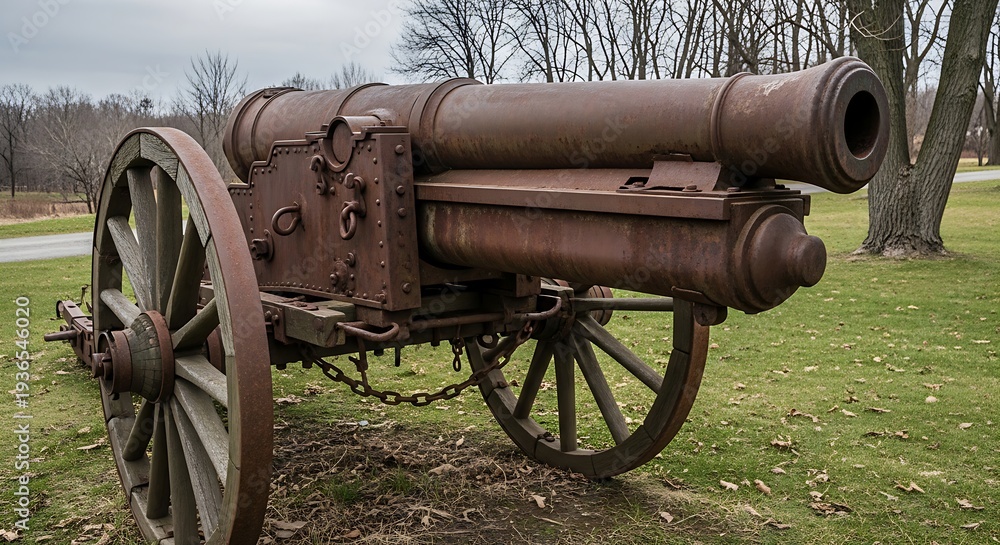 A rusted antique iron cannon stands on a wooden carriage in a grassy field with bare winter trees behind. #1936546020