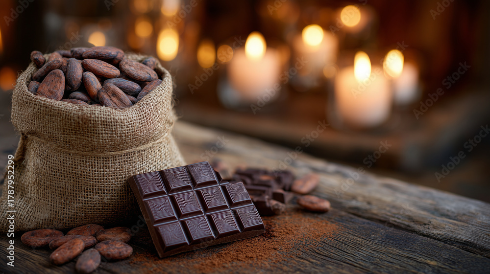 A rustic artisan chocolate presentation, where cacao beans fill a burlap sack, powder spills onto a rough wooden table, and dark chocolate bars lean gracefully against each other, #1787952299