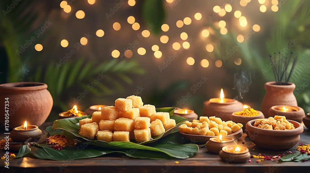 A rustic-style table setting with handmade Indian sweets like peda and halwa served in banana leaves, surrounded by earthen diyas and small incense burners. #1780547334