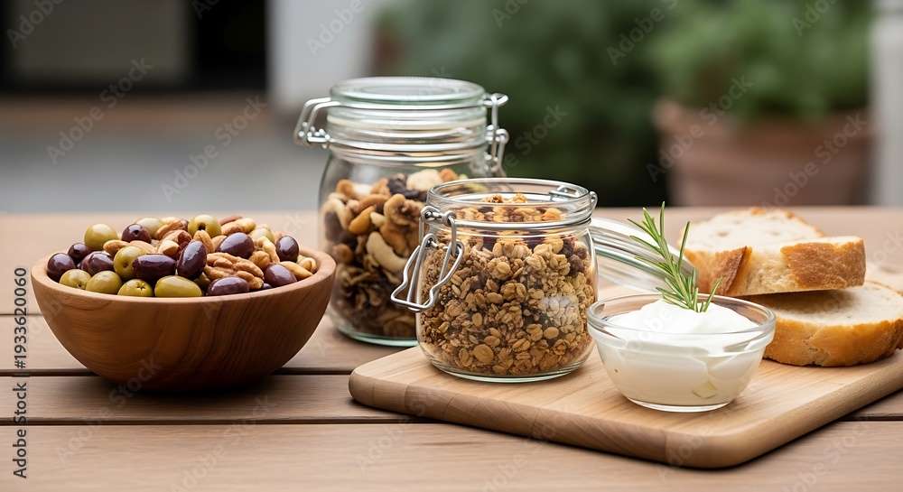 A rustic wooden table featuring jars of granola, a bowl of mixed olives, nuts, and fresh crusty bread slices. #1933620060