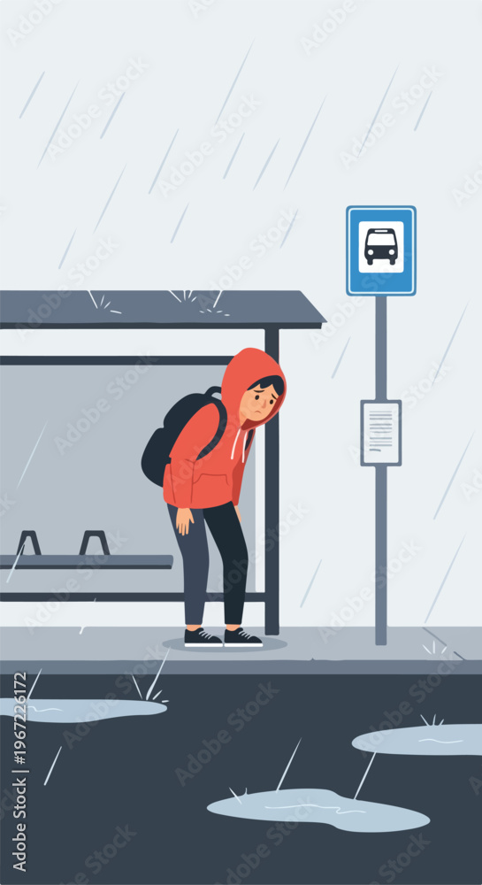 A sad person in a red hoodie waits for a bus at a station during a rainstorm #1967226172