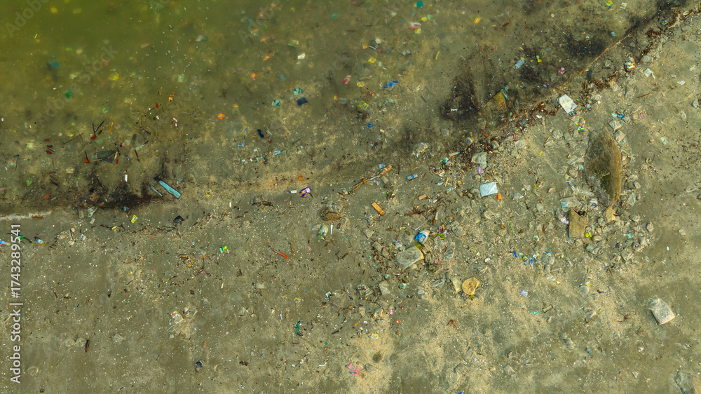 A sandy beach severely polluted with a large accumulation of plastic bottles and other trash. ocean and wave background.Environmental concept. #1743289541