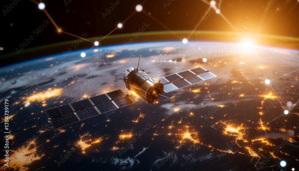 A satellite orbits the Earth, connecting the world with its technology. The image shows the curvature of the planet with a golden glow #1784739179