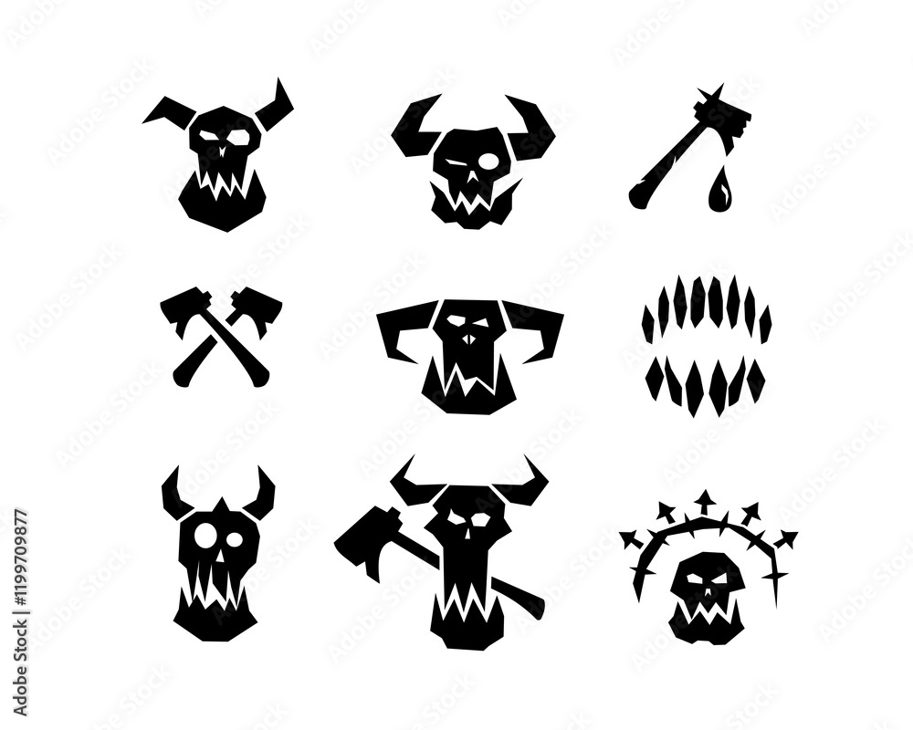 A savage orc symbol with a smiling skull, horns, and a shadowy outline, representing Gothic brutality, monsters, and warlords in a minimalistic style. #1199709877