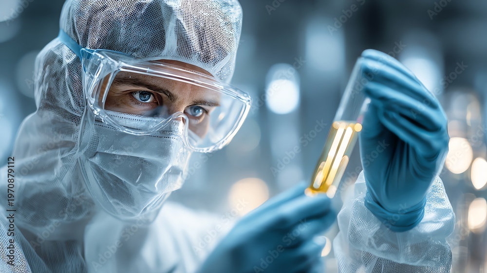 A scientist in protective gear carefully inspects a test tube filled with yellow liquid in a laboratory setting. The focus is on safety and precision in scientific research. #1970879112