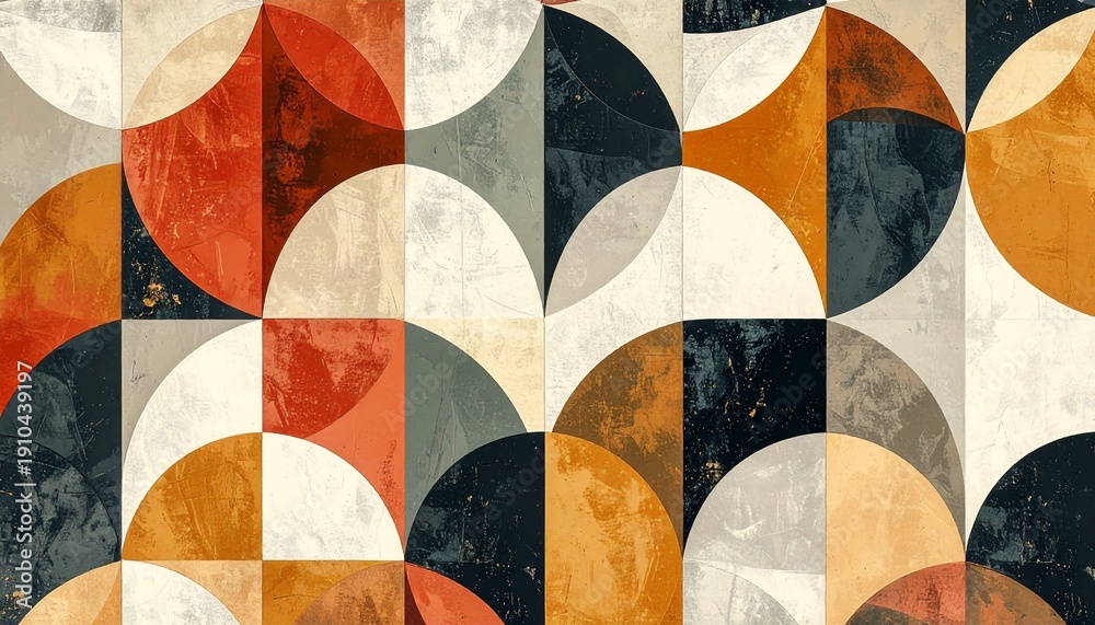 A seamless, repeating geometric pattern is displayed, featuring textured semicircles and squares arranged in a sophisticated, distressed mid-century modern style using warm #1910439197