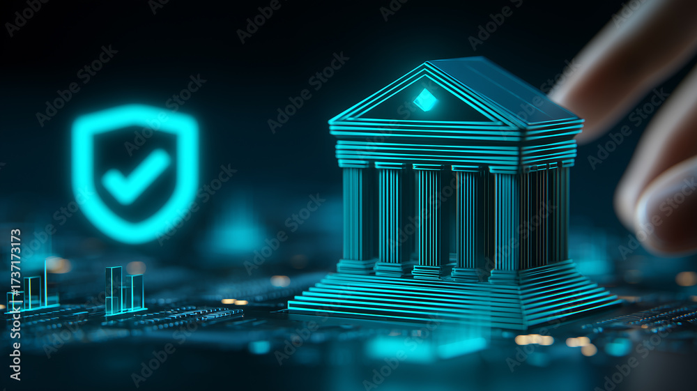 A secure digital bank building on a circuit board representing trusted finance infrastructure and regulatory compliance, illustrating protected transactions and institutional resilience. #1737173173