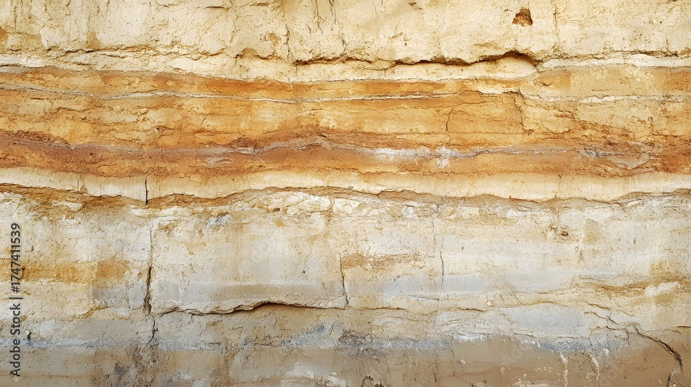 A sedimentary rock formation shows distinct layers of earth tones created by geological stratification process. #1747411539