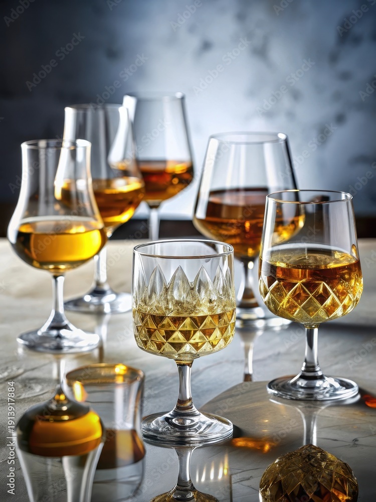 A selection of fine spirits in elegant glasses on a crisp white surface awaiting serving #1913917884