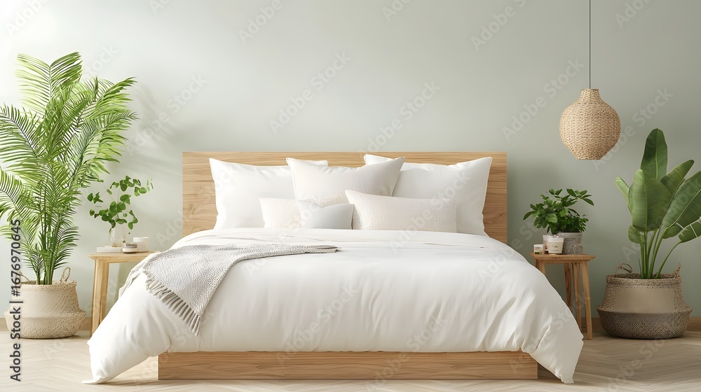 A serene and calming bedroom interior featuring a neutral toned mattress and bedding on a light wood floor complemented by lush greenery and natural accents for a harmonious minimalist aesthetic #1676970645