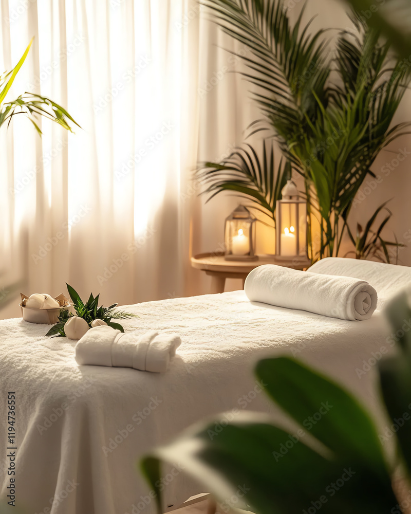 A serene and calming spa room featuring a massage table, soft towels, and lush greenery for ultimate relaxation. #1194736551