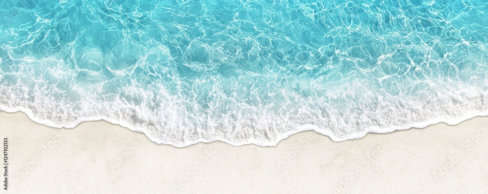 A serene beach scene showcasing gentle waves lapping at a sandy shore, with vibrant turquoise water blending into the light sand. #1247922133