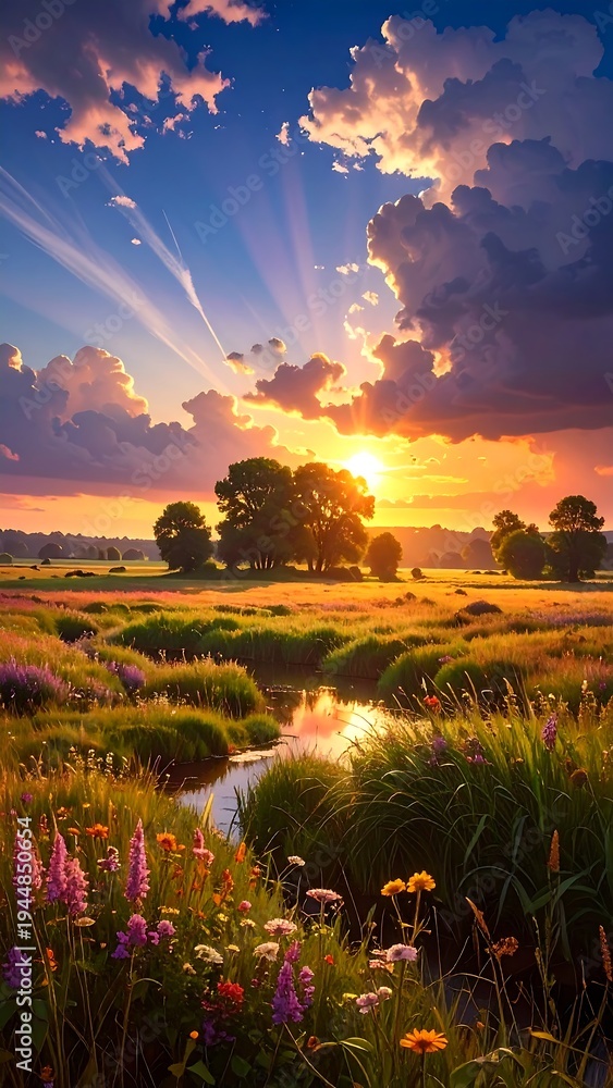 A serene landscape with a stream, wildflowers, and a vibrant sunset #1944850654