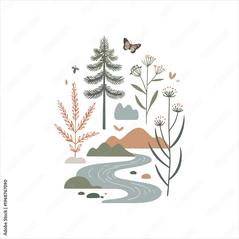 A serene landscape with a winding river and various plants and flowers #1968767090