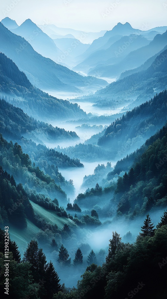 A serene misty mountain landscape ideal for calm and reflective themes, perfect for nature-related designs, meditation, or wellness events. #1129822043