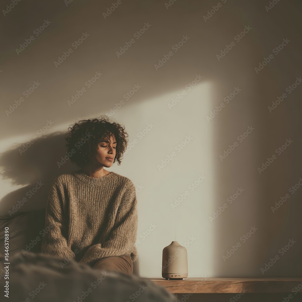 A serene moment featuring a woman in a cozy sweater, sitting peacefully in a softly lit room, with an essential oil diffuser nearby. #1646378890