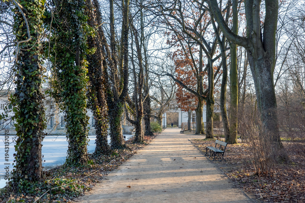 A serene pathway through a historic park in winter, lined with ivy-covered trees and a frozen lake. #1943137078