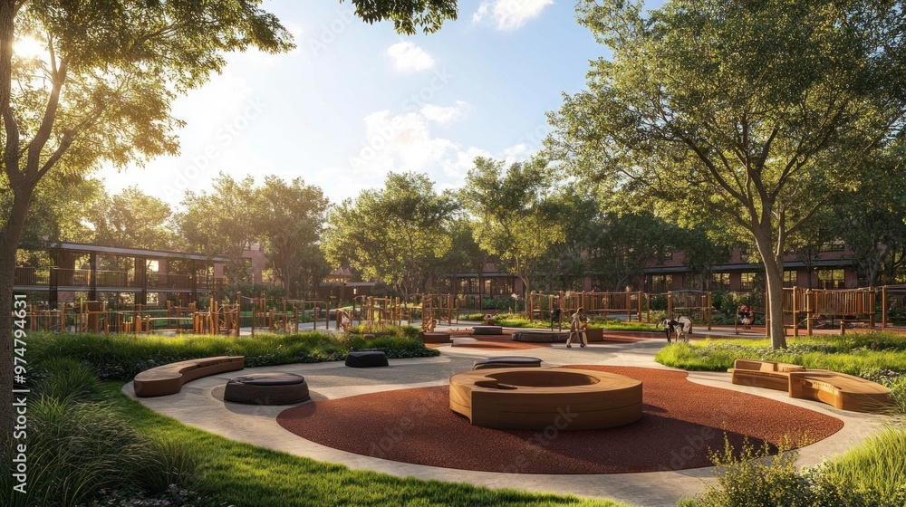 A serene playground surrounded by lush trees and seating areas. #974794631