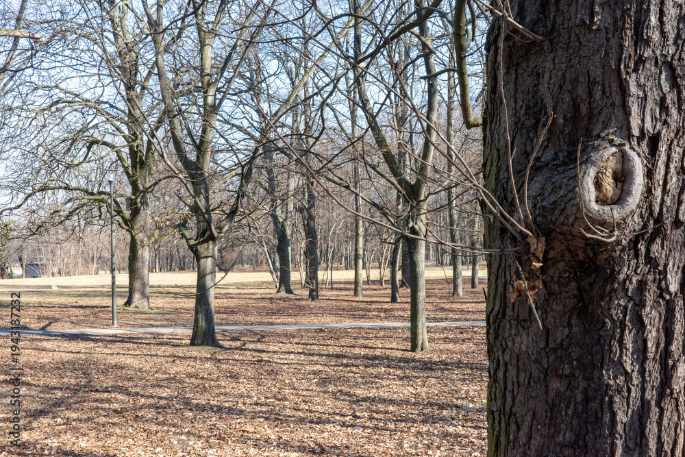 A serene public park landscape during early spring or late autumn with bare trees and fallen leaves. #1943137232