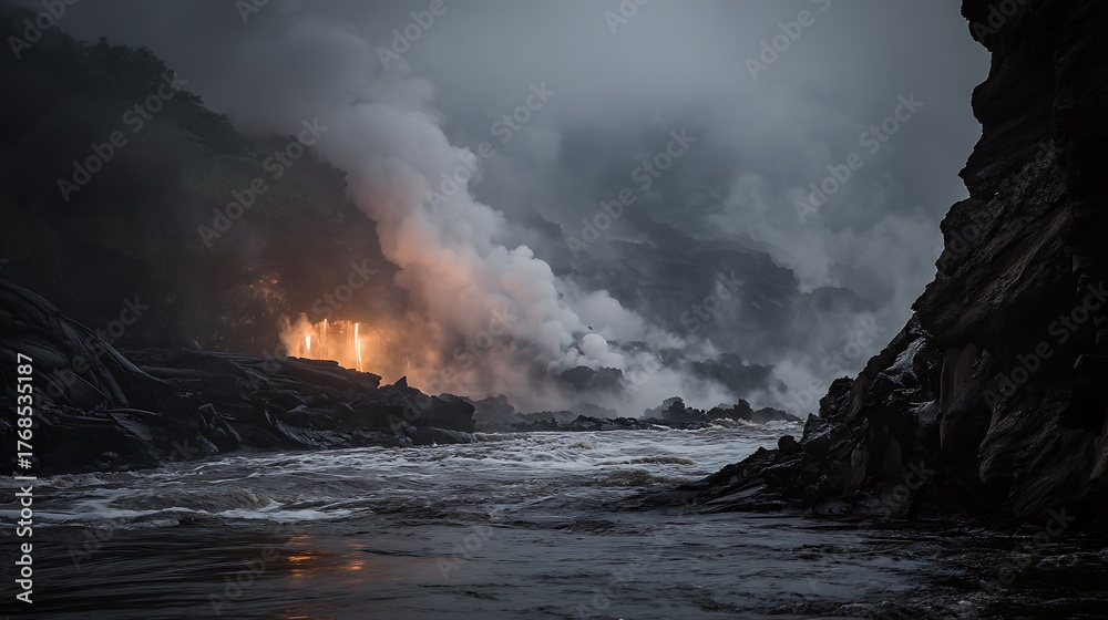 A serene scene where a waterfall gently touches flowing lava, steam rising between them, representing harmony of opposites, #1768535187