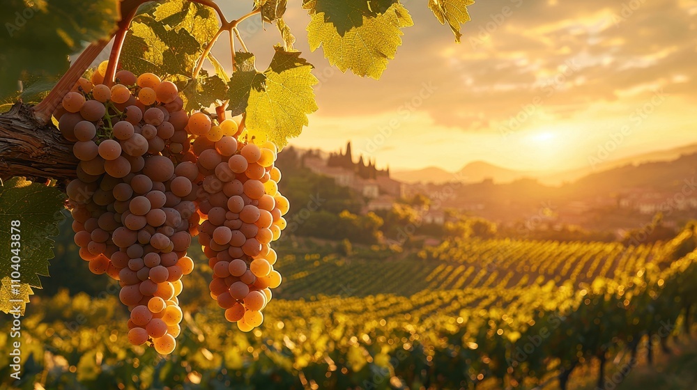 A serene vineyard at sunset, with ripe grapes hanging heavily from the vines. The golden light bathes the scene, creating a romantic and abundant atmosphere #1104043878