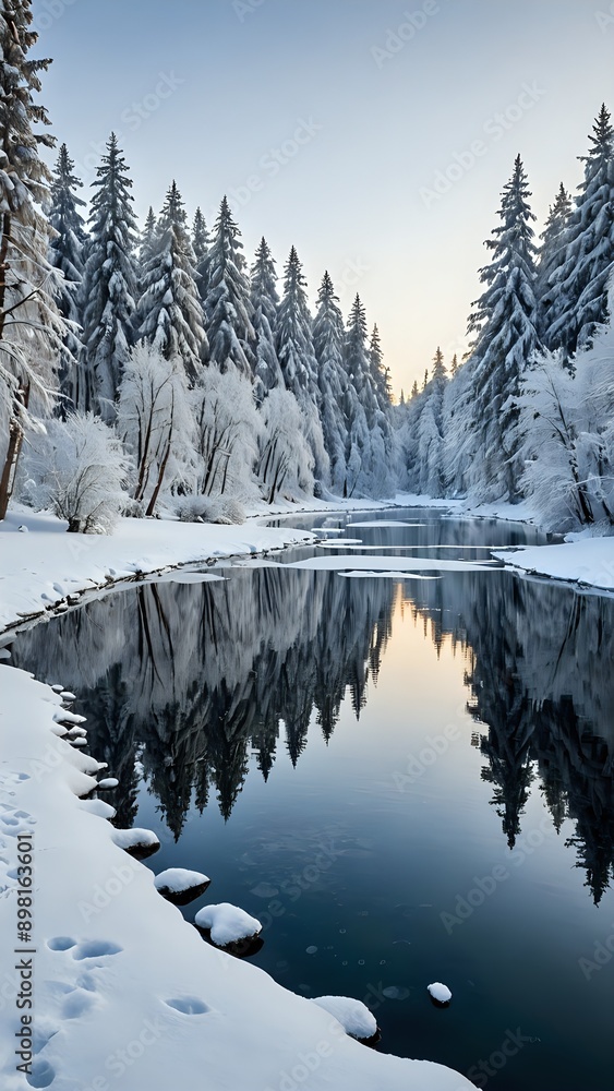 A serene winter landscape with snow-covered trees and a frozen lake, winter wonderland, peaceful, snowy, cold, tranquil, isolated, white, scenic, nature #898163601