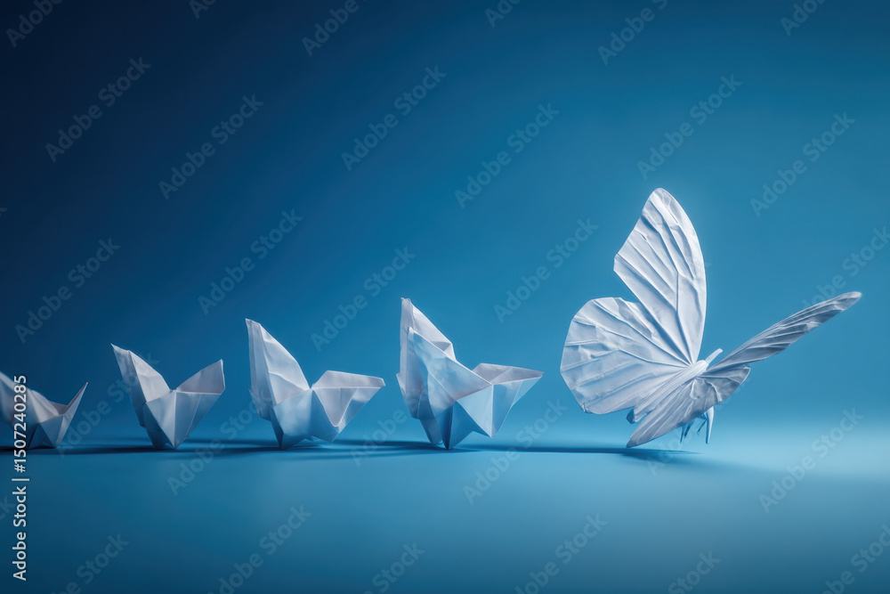 • #1507240285 A series of origami butterflies, ranging from simple to complex designs, transition toward a fully formed butterfly on a smooth blue surface, symbolizing growth and transformation